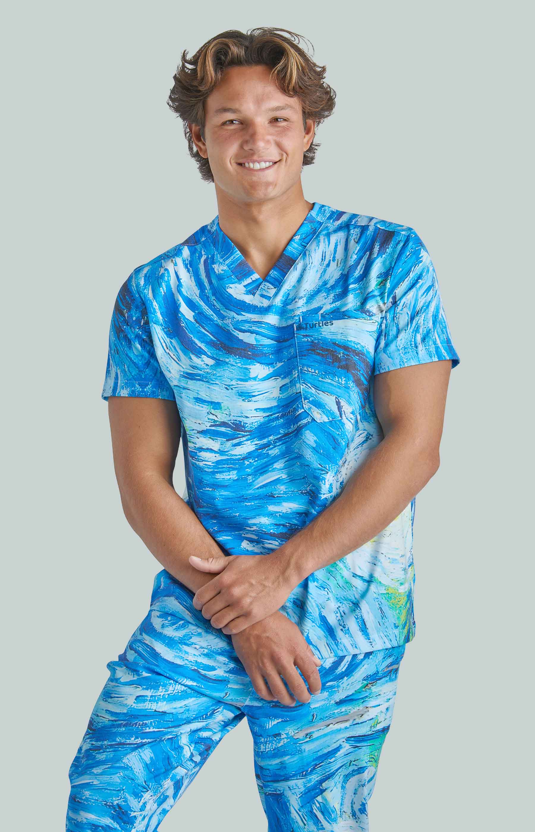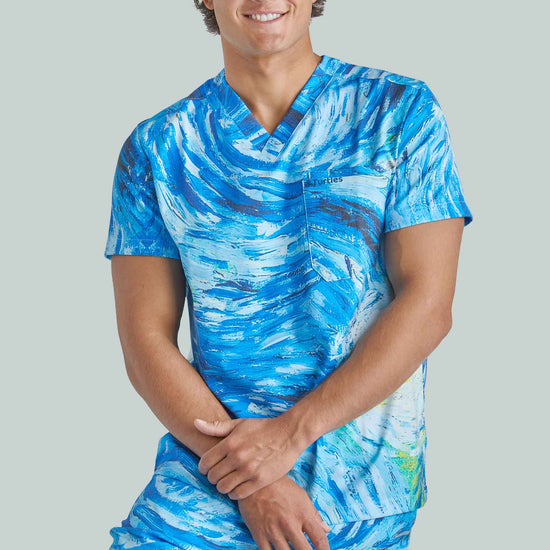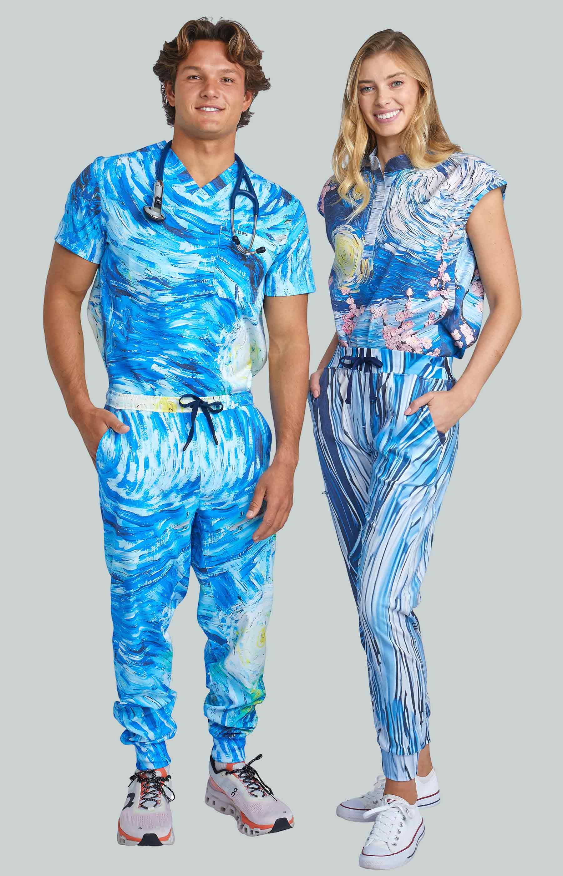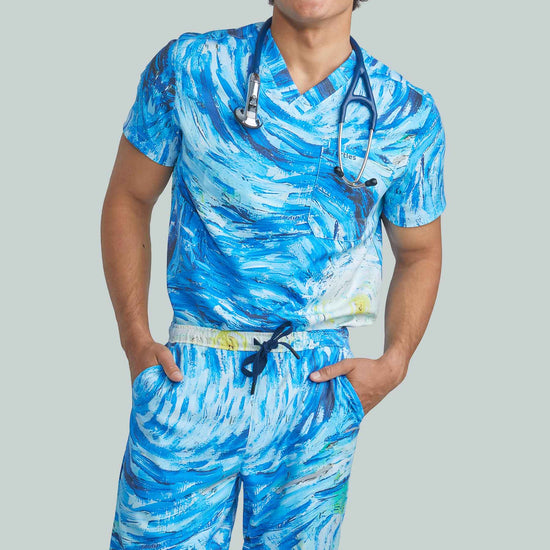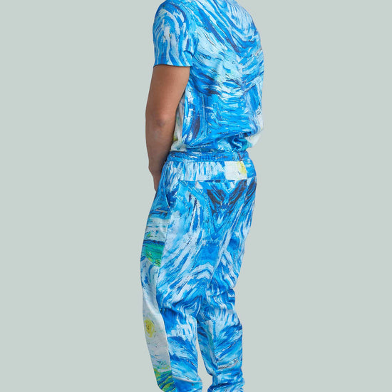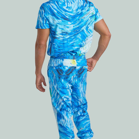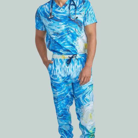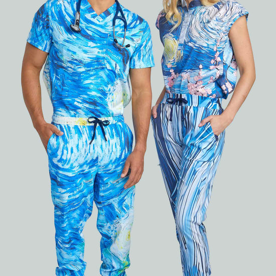 Starry Night Top with Joggers by Turtle Scrubs draws inspiration from the iconic Starry Night painting, featuring swirling deep blues and vibrant accents. This modern, athletic set includes a clean, tailored top and tapered jogger pants with a mid-rise elastic waistband, cuffed ankles, and multiple utility pockets, professional, comfortable, and streamlined.