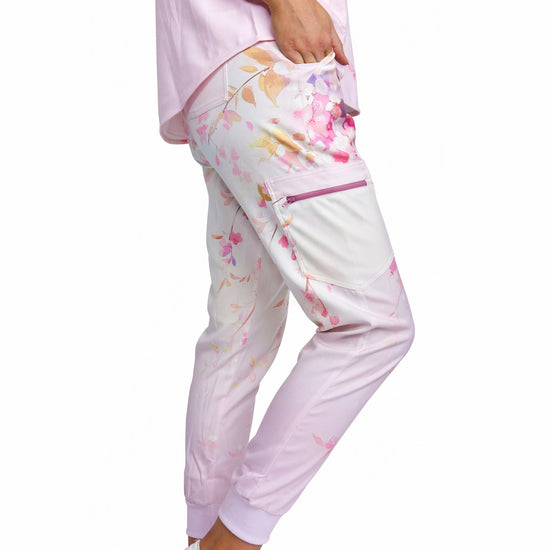 Pink Peace Top with Joggers by Turtle Scrubs features a soothing pink hue and a modern, athletic fit, with a clean tailored top and tapered jogger pants with a mid-rise elastic waistband, cuffed ankles, and multiple utility pockets, professional, comfortable, and streamlined.