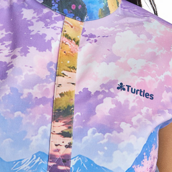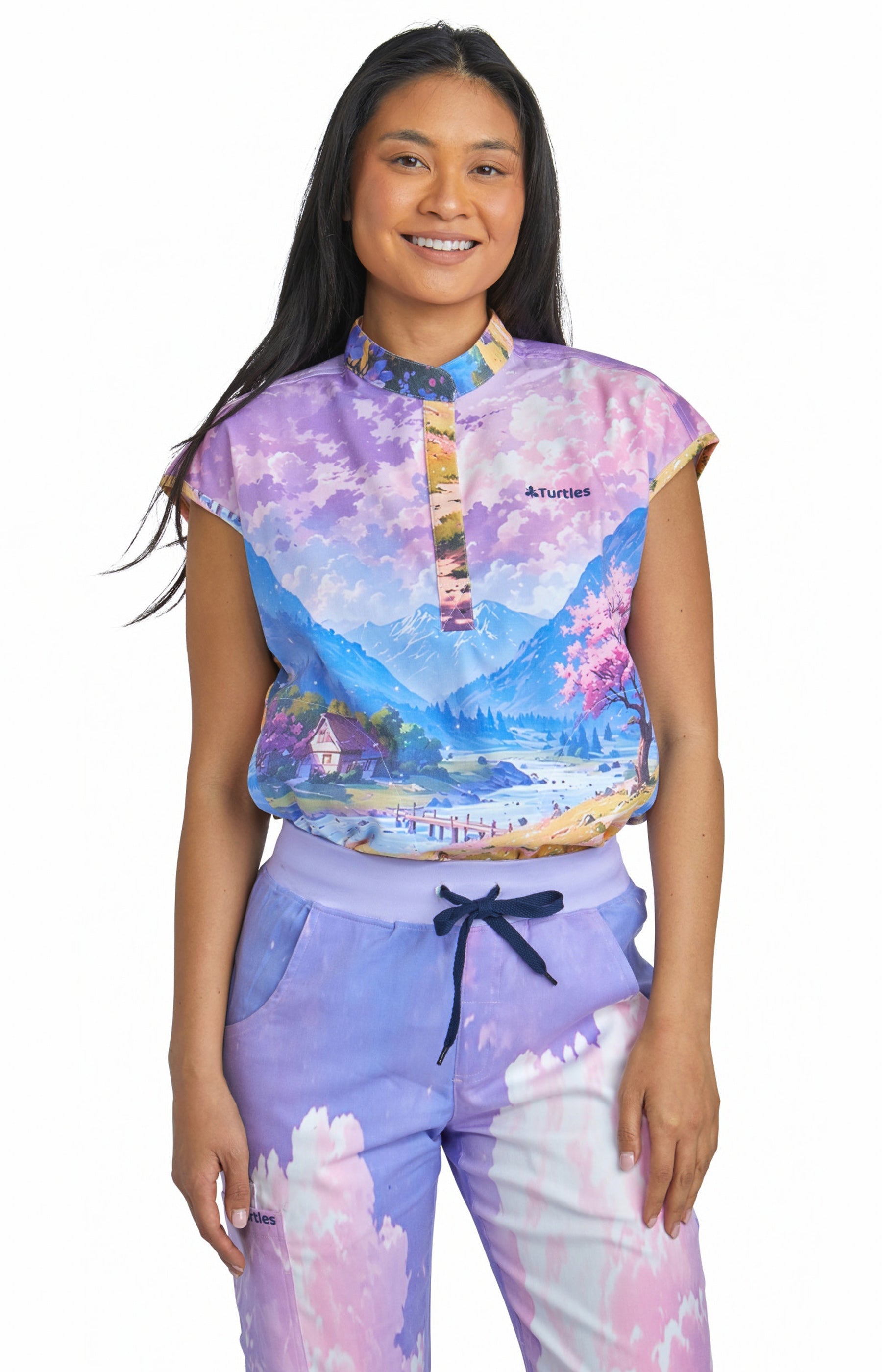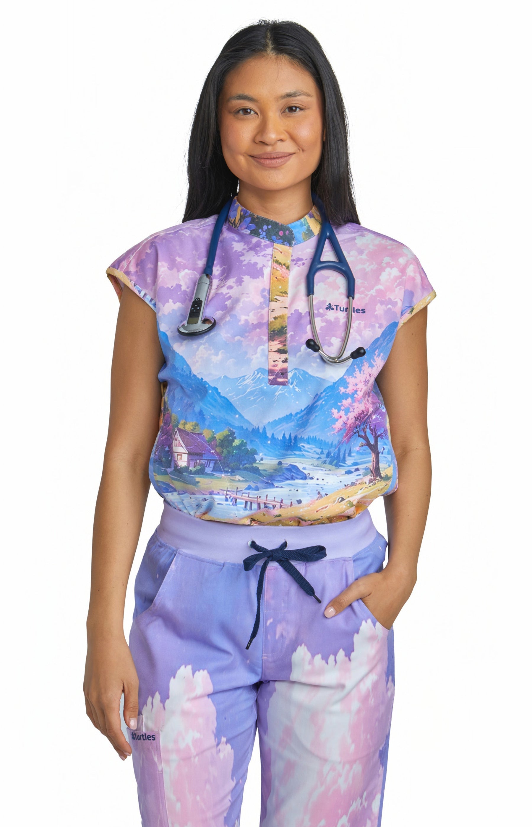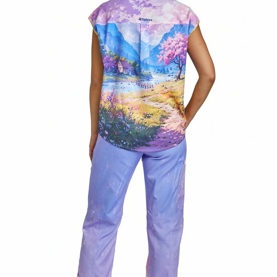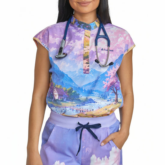 Purple Sky Top with Straight Pant Set by Turtle Scrubs features a calming purple scene and a modern, tailored fit, with a clean top and straight-fit pants with multiple functional pockets, offering all-day comfort with a refined, streamlined look.
