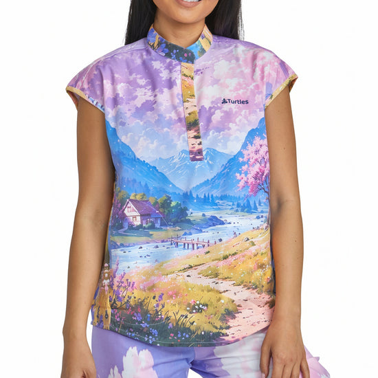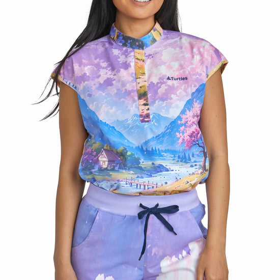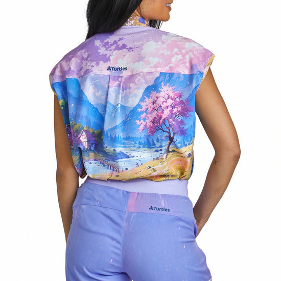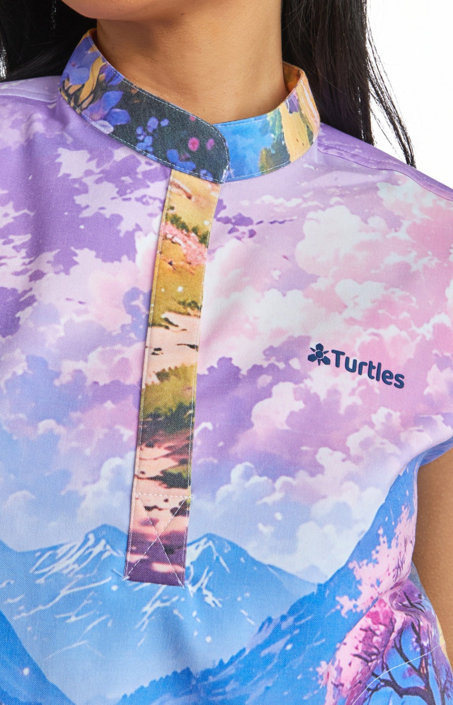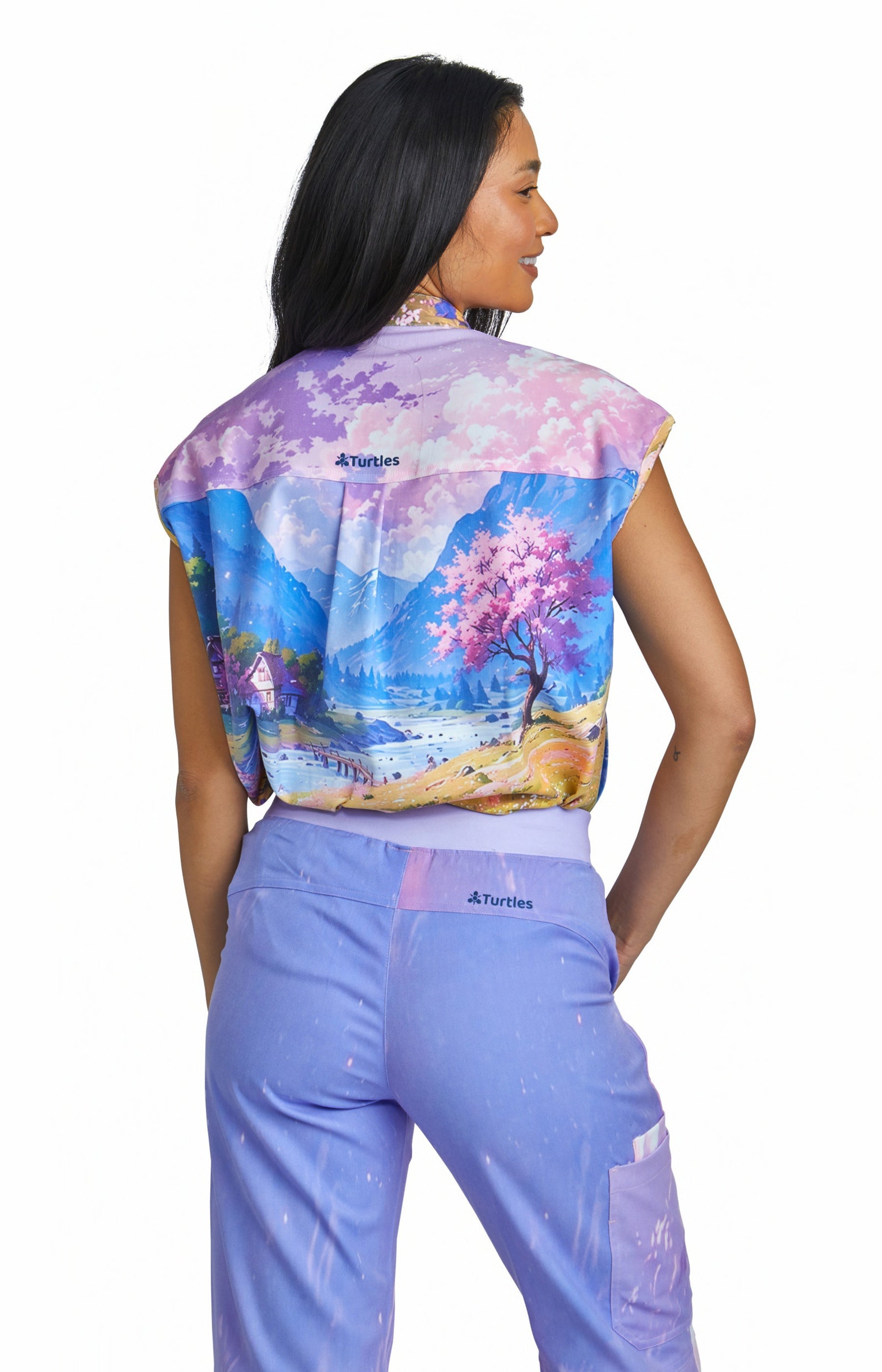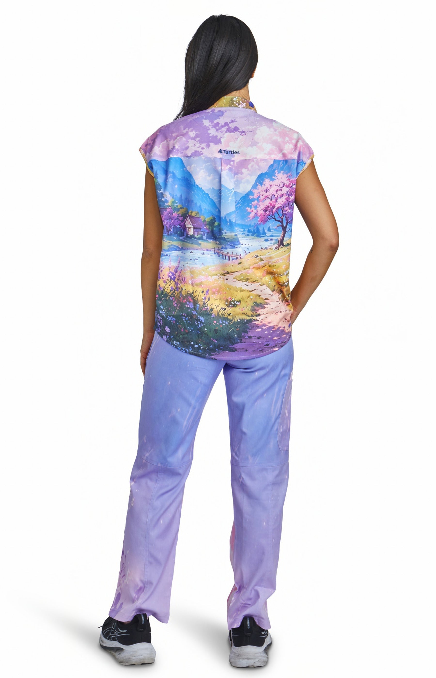 Purple Sky Top with Straight Pant Set by Turtle Scrubs features a calming purple scene and a modern, tailored fit, with a clean top and straight-fit pants with multiple functional pockets, offering all-day comfort with a refined, streamlined look.